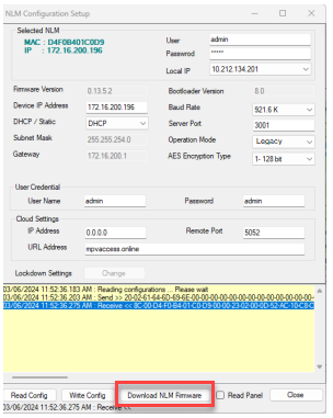 6. Click on “Download NLM Firmware.” Navigate to the uniVerse Finder Utility folder you downloaded and extracted. Select the "Firmware Folder," then select the MVP Access Cloud ethernet firmware for the specific Controller model # and click on the "Open" button to begin download.